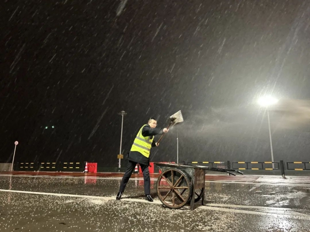 相关路段营运单位第一时间启动除雪保通应急预案,与高速交警、路政等部门协同驻防路面重点部位,及时做好车辆疏导、尊龙凯时管控、救援和事故处置等工作,尽最大努力降低雨雪天气给道路通行带来的影响。受寒潮天气影响较重的山区路段迅速调配应急人员、除雪设备及物资,针对山区路段的长大桥梁、隧道出入口、陡坡弯道等关键节点进行重点布控,设置连续警示提醒标志,采取“小循环多频次”模式开展融雪剂撒布作业。其中,淮河特大桥、桃墅岭隧道等易结冰路段还首次启用除雪融冰喷淋系统,防止桥面夜间上冻结冰。