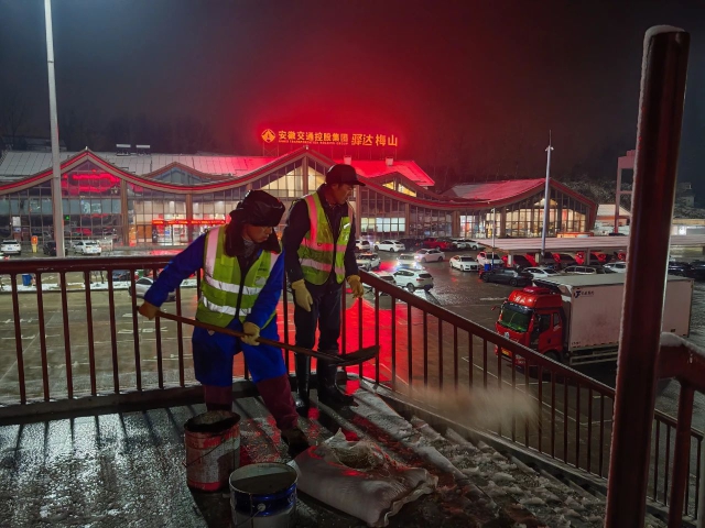 受寒潮天气影响,1月25日夜至26日凌晨,我省沿淮淮北地区、大别山区和皖南山区温度骤降,出现雨雪叠加天气。集团相关单位迅速响应,连夜开展融冰除雪工作,奋力护航人民群众春节回家路。截至1月26日上午9时,集团相关营运单位共计出动人员600余人次,机械设备280余台班,撒布融雪剂600余吨。集团所辖路段路面无积雪,车辆有序通行。